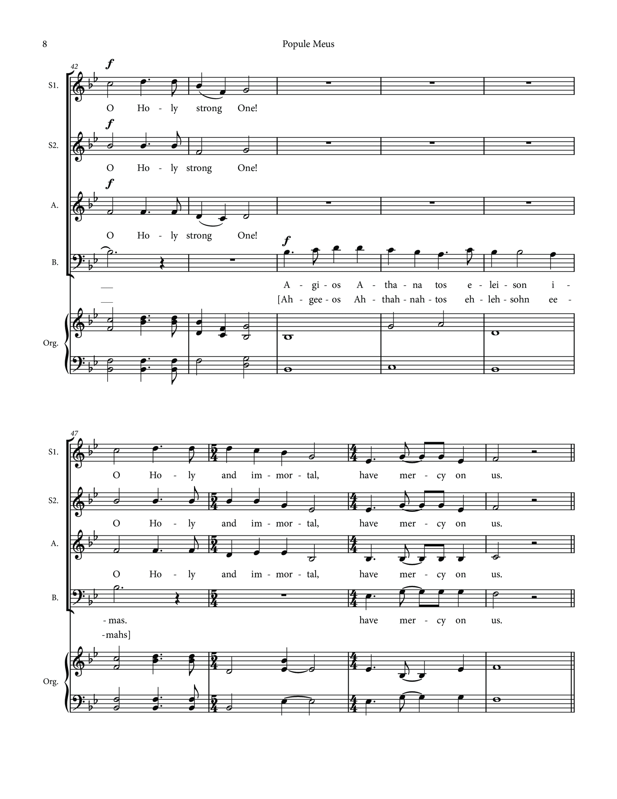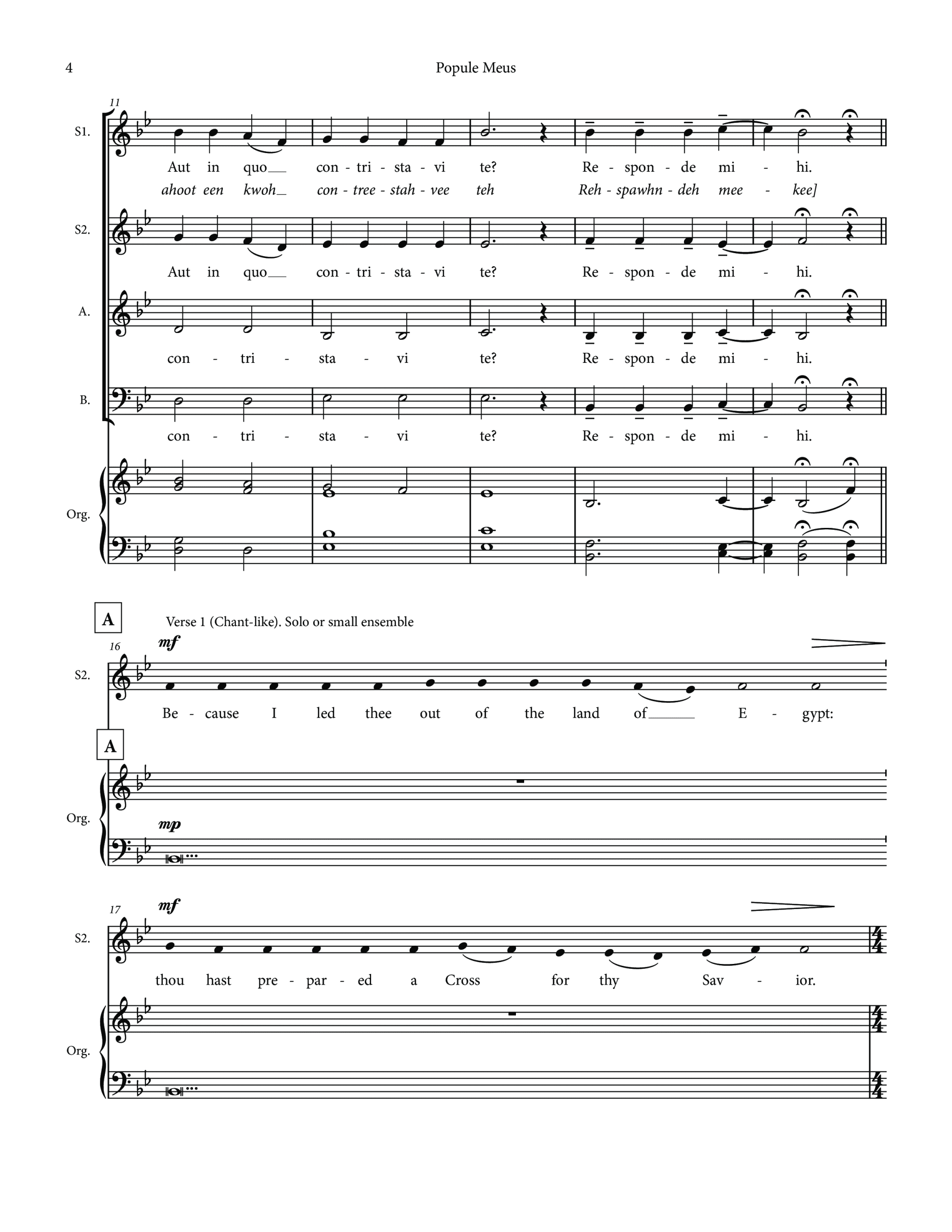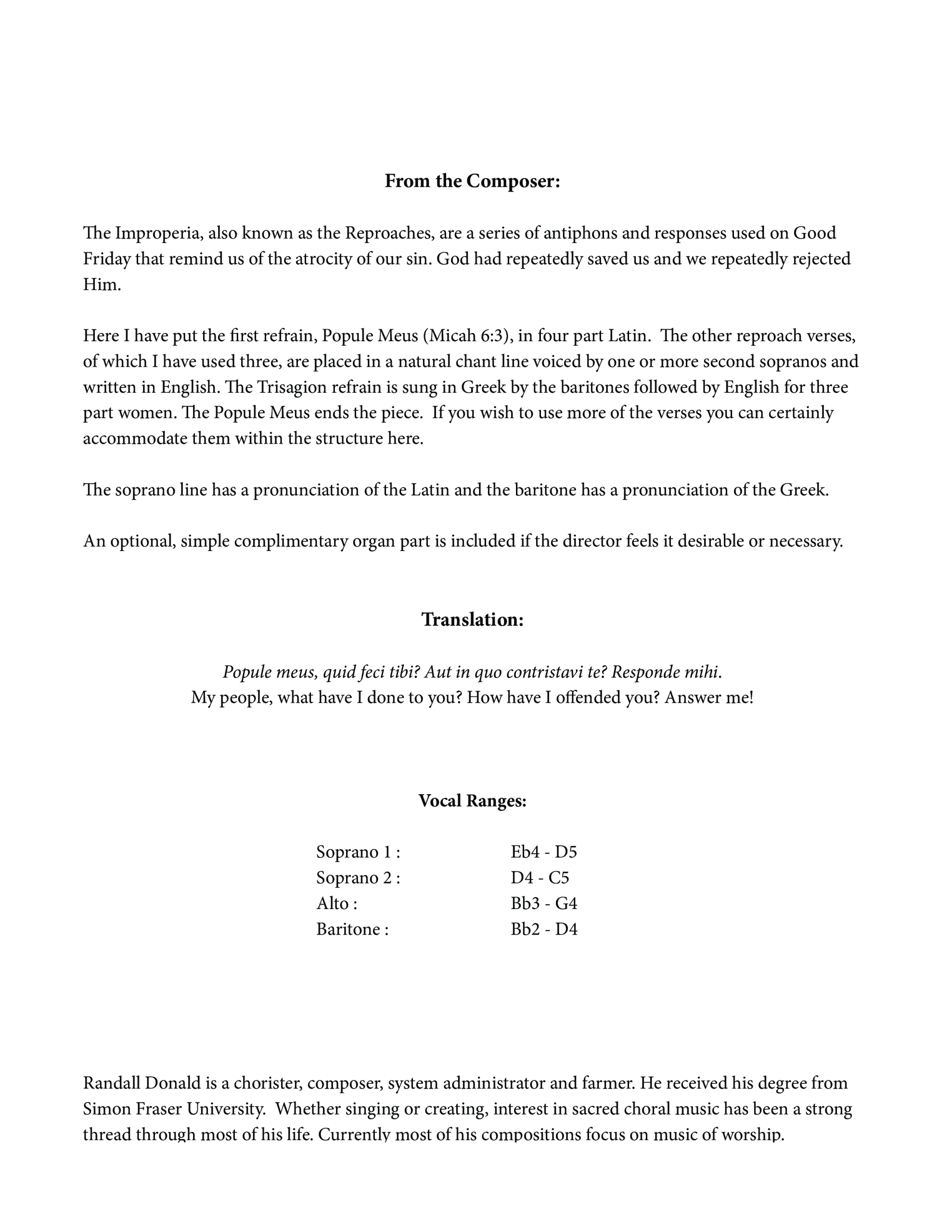 Here I have put the first refrain, Popule Meus (Micah 6:3), in four part Latin. The other reproach verses, of which I have used three, are placed in a natural chant line voiced by one or more second sopranos and written in English. The Trisagion refrain is sung in Greek by the baritones followed by English for three part women. The Popule Meus ends the piece. If you wish to use more of the verses you can certainly accommodate them within the structure here.