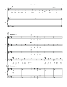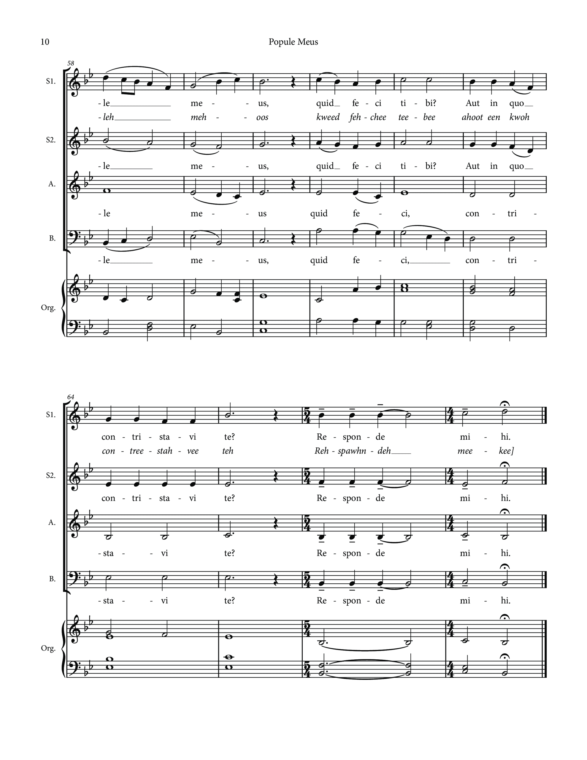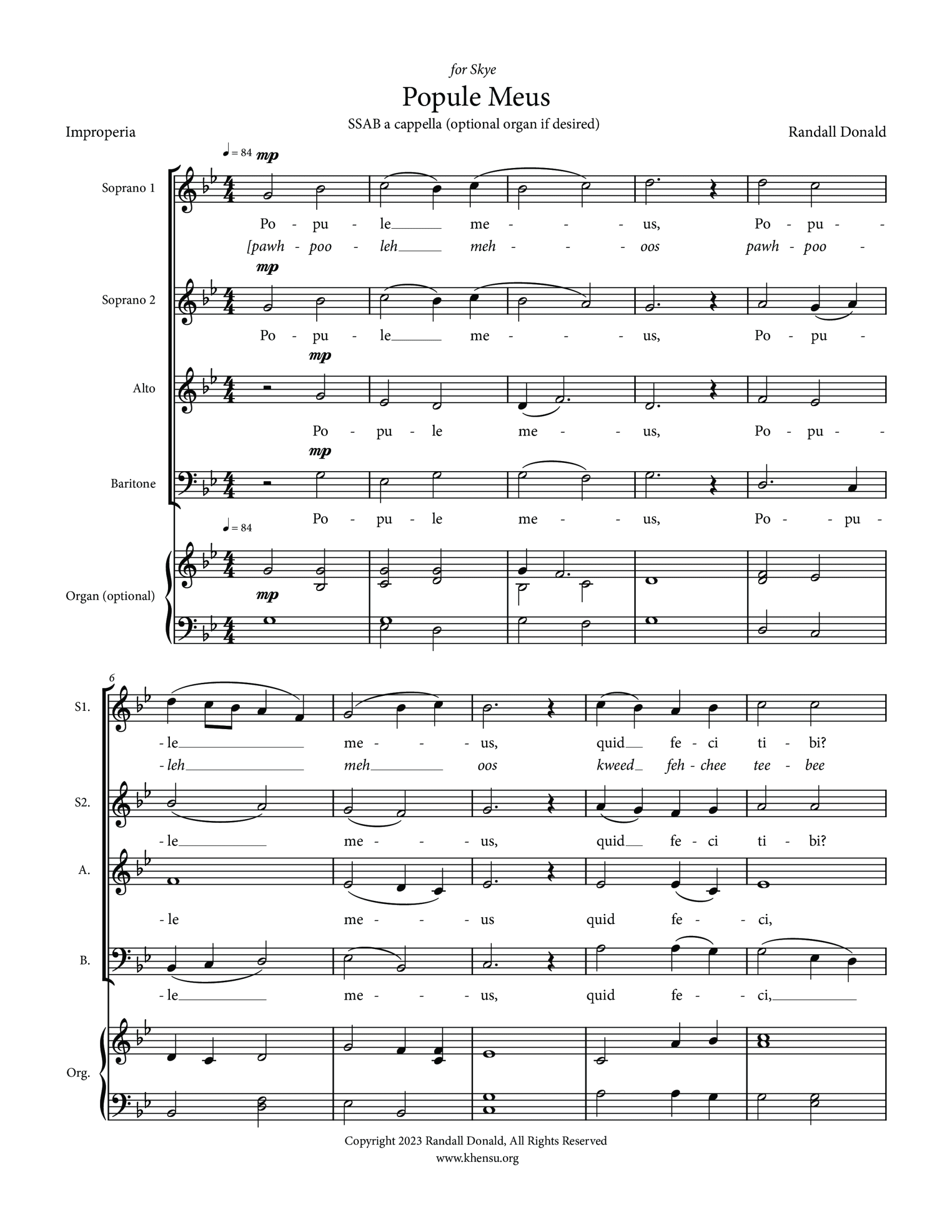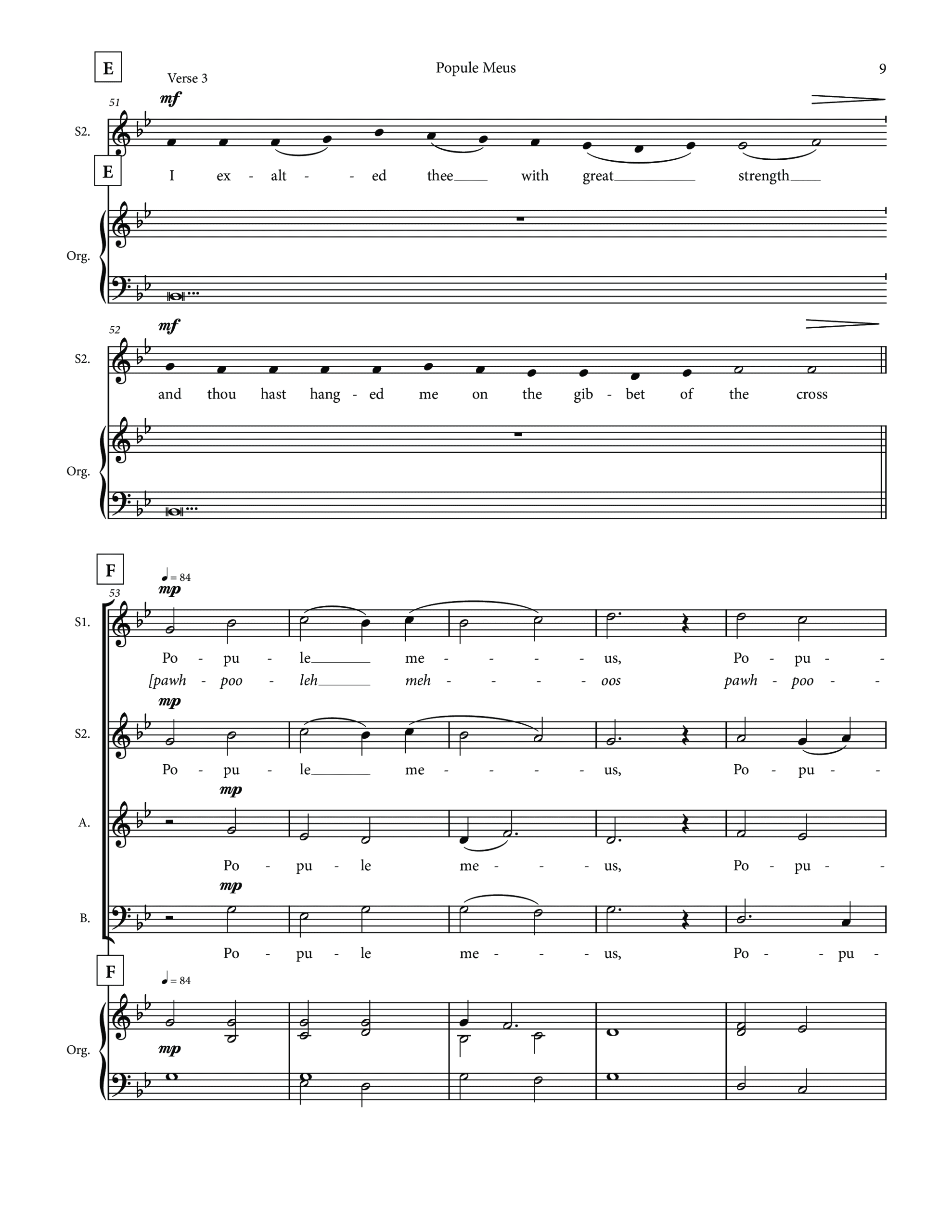 Here I have put the first refrain, Popule Meus (Micah 6:3), in four part Latin. The other reproach verses, of which I have used three, are placed in a natural chant line voiced by one or more second sopranos and written in English. The Trisagion refrain is sung in Greek by the baritones followed by English for three part women. The Popule Meus ends the piece. If you wish to use more of the verses you can certainly accommodate them within the structure here.